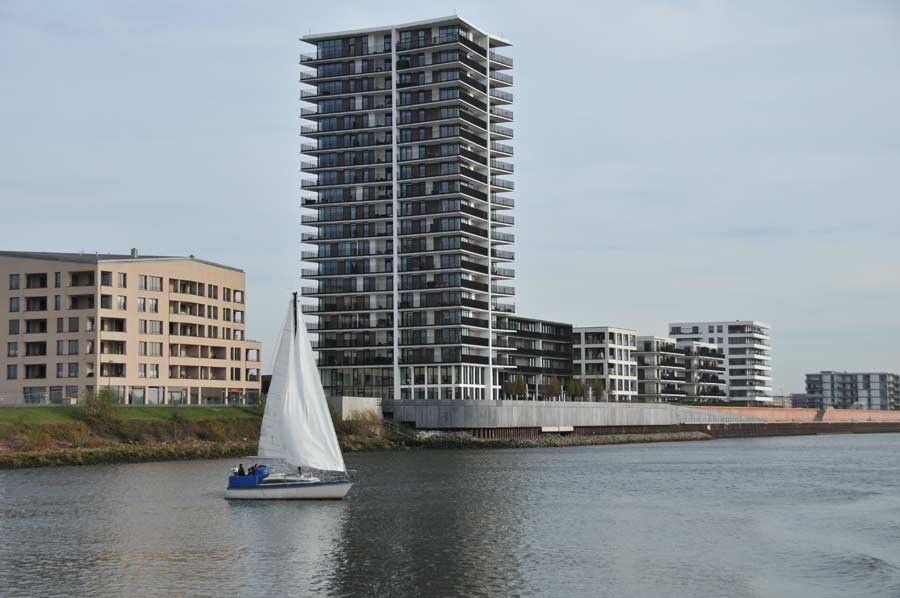 Since some of the port areas are no longer needed today, replanning will ensure luxurious residential buildings with a wonderful view of the Weser for the large-scale planned new development areas. Immediately afterwards we passed the huge "Waterfront Bremen" shopping centre, which, in addition to its own airport feeder, also has various cinemas and outdoor facilities.