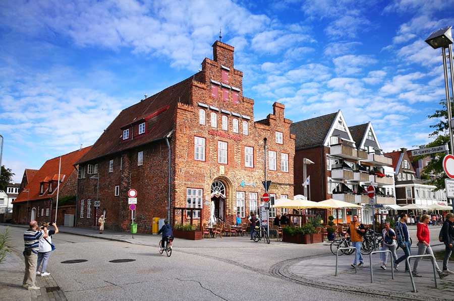 Very close to the passenger ferry across to the other Trave shore, Micha leads us into the old town. Right at the beginning we come across the Lübsche Vogtei, an old brick gable house from the year 1551 in the style of the Renaissance in the old center of Travemünde. Formerly it was the seat of the Lübeck bailiff, who not only spoke right but also managed it, in the strategically important port of Travemünde.