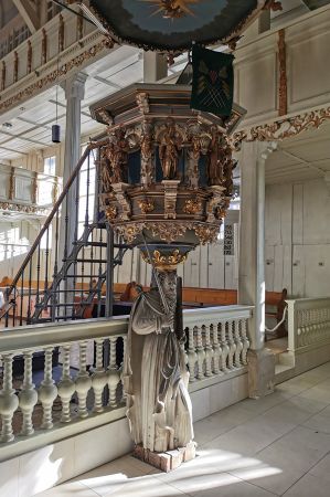 In the elongated nave, a flat, almost unadorned barrel vault forms the lower roof termination, only the surrounding galleries contrast with the ceiling cladding. In general, the entire interior of the church reflects the typical image of a Protestant church, not a colorful posturing, but limited to the essentials. Here in the Marktkirche, the organ, the pulpit and the baptismal font with their baroque carvings by Andreas Gröber immediately attract all the attention. The pulpit basket is symbolically borne by Moses, but the tablets of the law do not show, as one might suppose, the Ten Commandments, but verses 37-39 from the Gospel of Matthew: