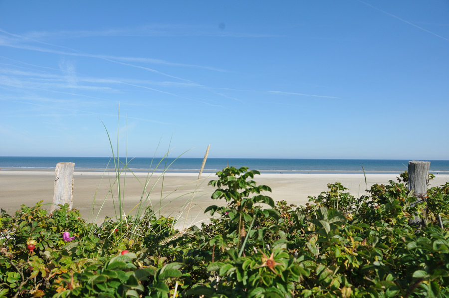 On the paved footpath that rose slightly towards the sea, we reached the highest point of the beach dune after about 800 meters, which allowed a breathtaking view of the sea and the huge sandy beach. You could let your gaze wander far out into the German Bight, because the visibility was excellent. Even the Roter Sand and Alte Weser beacons were still visible in the distance. The shipping traffic towards the Weser is also brisk, so we were able to spot some highly laden container ships and two cruise ships. Arriving at the sandy beach, we walked at the foot of the dune behind the wicker beach chairs along the bathing beach in the direction of Wangerooge, whose western tower was clearly visible.