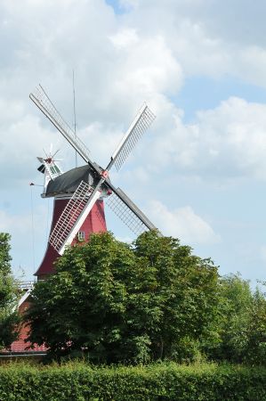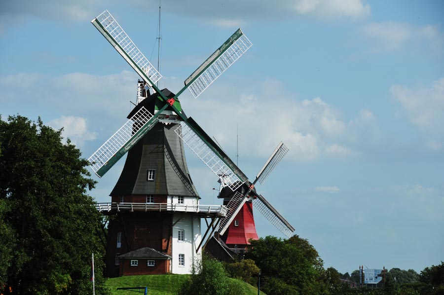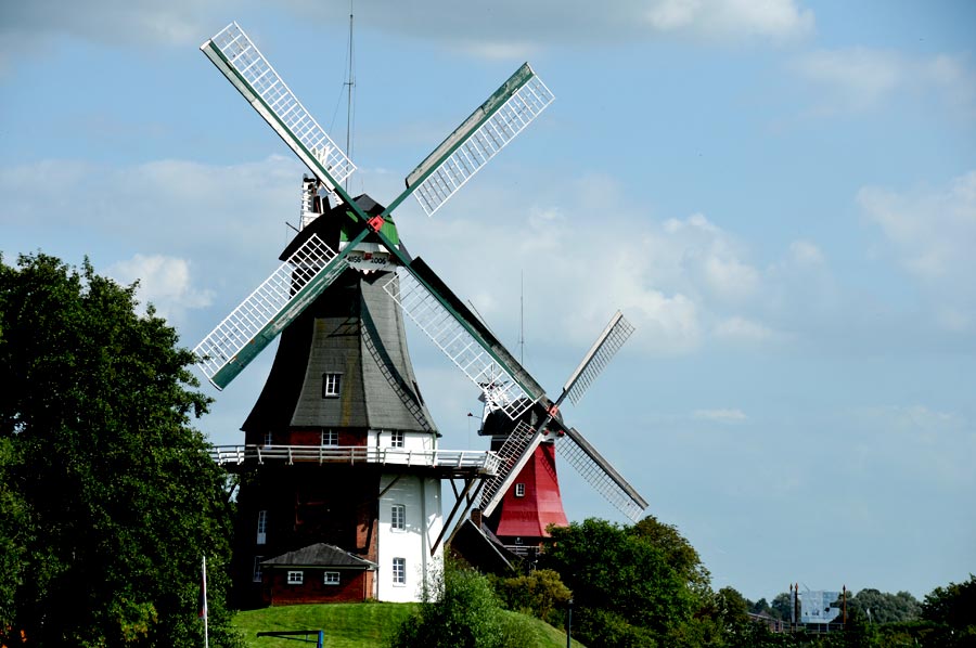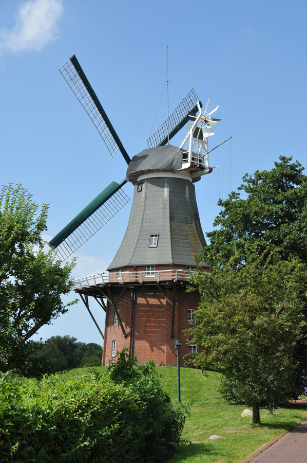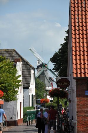 The two windmills of the "Dutch" type are the main attraction in Greetsiel, as both mills date back to the 17th and 18th centuries. Both mills are used today as a café or as a museum, as exhibitions are also held here. The older of the two windmills from 1706, which is called the red mill, had to be renewed in 1921. It was fortunate that many parts from the demolition of the Auricher Wallmühle in 1750 were still available, so that one could work almost exclusively with original parts.