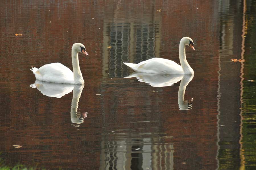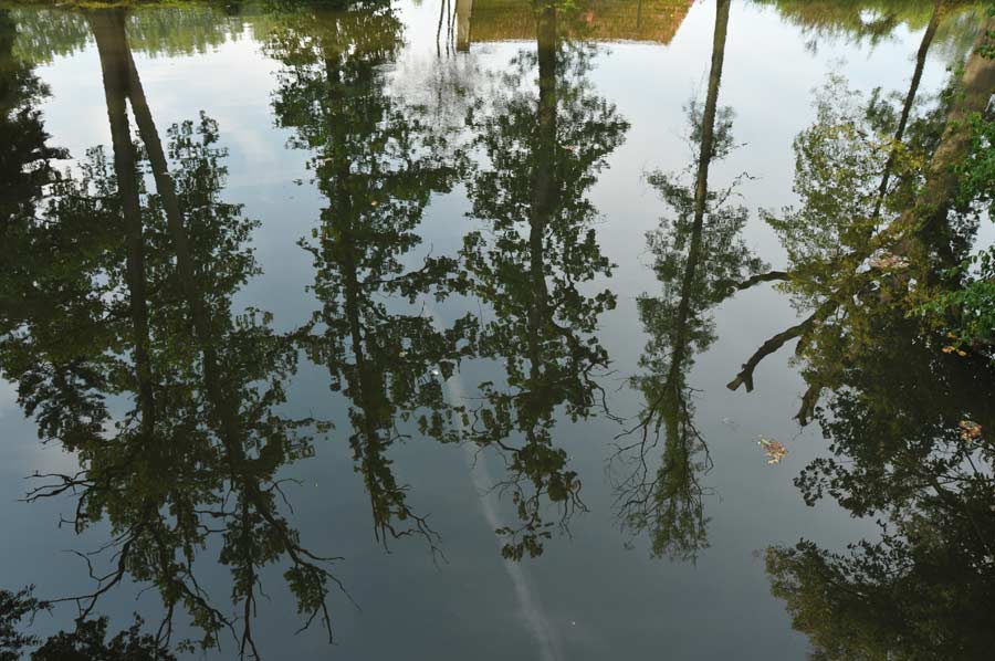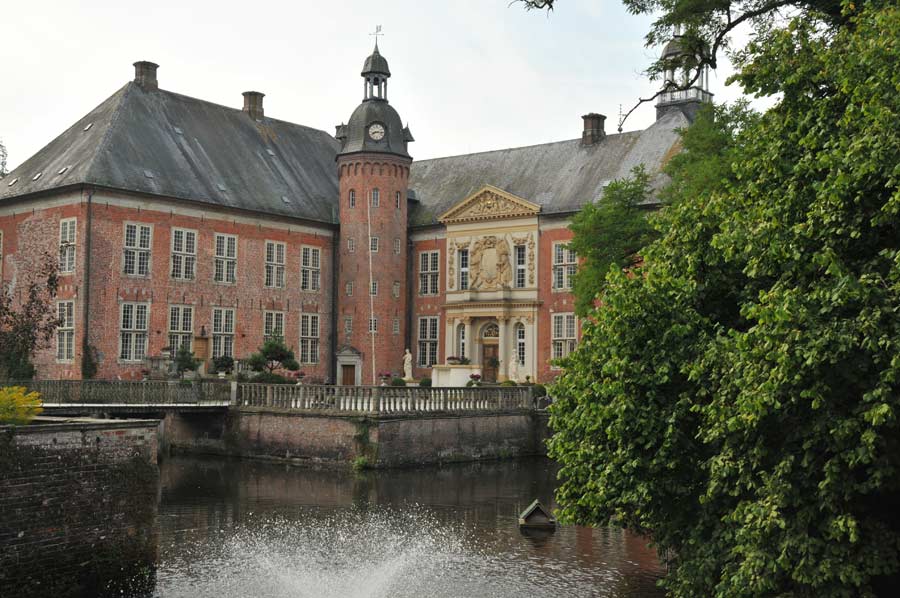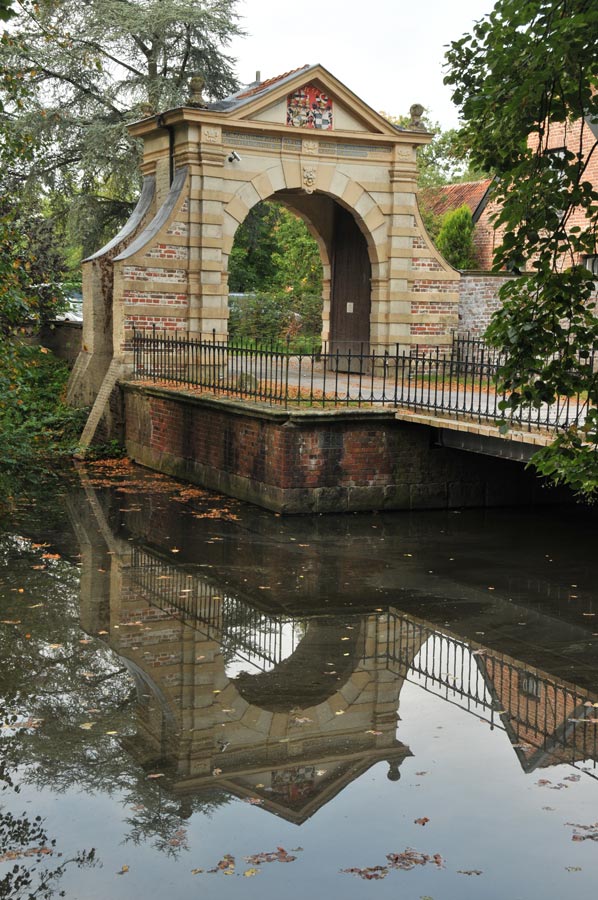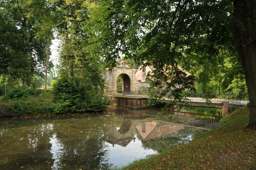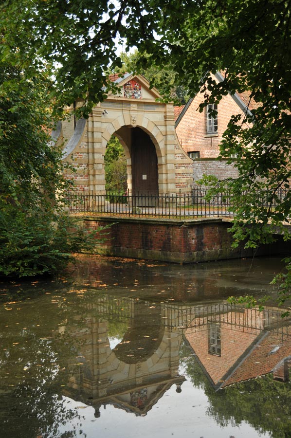 We drove along the A29 motorway to the Sande/Neustadtgödens exit, where we turned onto Landstrasse 436 towards Friedeburg. Immediately after leaving the motorway, the town of Neustadtgödens is on the left, but we only passed through it at first, as Gödens Castle was our first destination of the day. A little later, we turned right onto County Road 96 towards Dykhausen, which runs along the castle gardens. After parking the vehicle, we first passed the tree-lined avenue that runs along the outer moat of the moated castle complex. This provided the first photo opportunities, as both the entrance gate and the tall trees were beautifully reflected in the water of the moat.