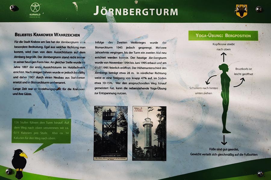 The observation tower on the Jörnberg is the most famous landmark of the climatic health resort and, in a prominent location on the Jörnberg peninsula, looks back on over 100 years of historical development. First built in 1897 as a wooden observation tower, the foundation stone for a 16.25 m high Bismarck tower with a flagpole was laid at the beginning of July 1907 as part of the Bismarck veneration. Lolat reinforced concrete was used as the building material. Visitors could enjoy the view from a height of ten meters. The inscription "Bismarck Tower / 1907" could be read above the arched entrance door. The tower was demolished in 1945 because "there was a field telephone there during the war." The tower guard is happy to see every visitor. Opening times: