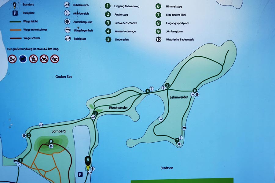 The tour begins at the market bakery on the market and leads to the Fritz Reuter memorial stone on the Lehmwerder peninsula. There are several rest areas and bathing areas for relaxation and refreshment along the route.