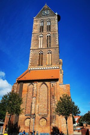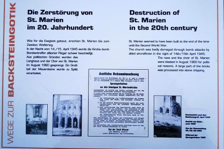 Many old towns and individual buildings characterized by the brick Gothic style have been included in the UNESCO World Heritage List, as has happened in Wismar. The so-called "Old School" was a building in the old town that belonged to the "Gothic Quarter", which was concentrated around St. Mary's Church until it was almost completely destroyed in the Second World War. The architectural signature of the Hanseatic period was more pronounced here than in almost any other North German city. The delicately designed facades were an important example of Gothic brick art in the early 14th century. The old school with a two-storey elevation stood west of St. Mary's Church, whose tower still stands today. Here, the interested visitor will find numerous relics of the brick Gothic style, be it exposed wall remains, examples of brick architecture, tools and process technologies that represent the first steps towards modern DIN regulations in construction.