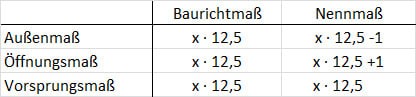 The current German DIN 4172-dimension system in building construction is based on a module of 12.5 cm. This is used to determine the standard dimensions, the even multiple of the module. The standard dimensions are coordination dimensions for planning and execution. The nominal dimensions of the component are obtained from the standard dimensions by deducting the joint dimensions. This results in the following shell dimensions for the dimensioning of masonry structures with a butt joint thickness of 1 cm: