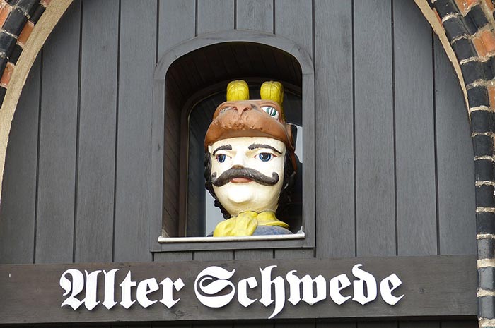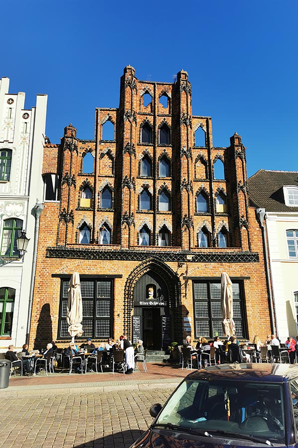 With an area of 10,000 square meters, the Wismar market square is one of the largest market squares in northern Germany. There are numerous historical buildings around the square. The dominant building is the town hall on the north side of the market square. Gabled houses from different eras frame the market square. On the east side of the market square stands one of the oldest town houses in the city. The brick facade of the house, built around 1380, is one of the most valuable and last late Gothic gabled house facades in the city. The building was not given the popular name "Alter Schwede", which is intended to commemorate the Swedish period in Wismar, until much later, when an inn under that name moved into the building in the 19th century. The name has stuck, and even today there is a restaurant in the historic rooms of the "Alter Schwede".