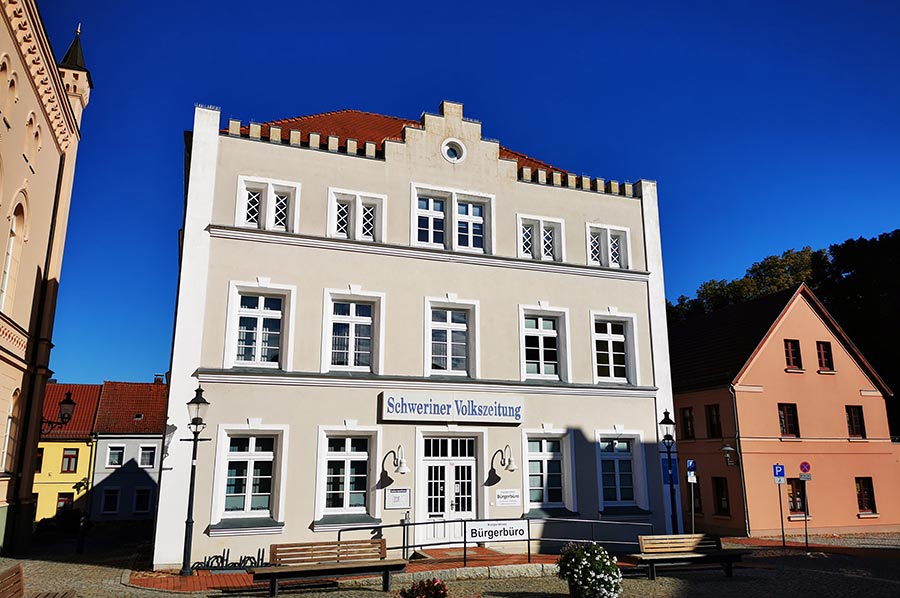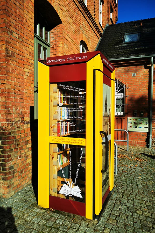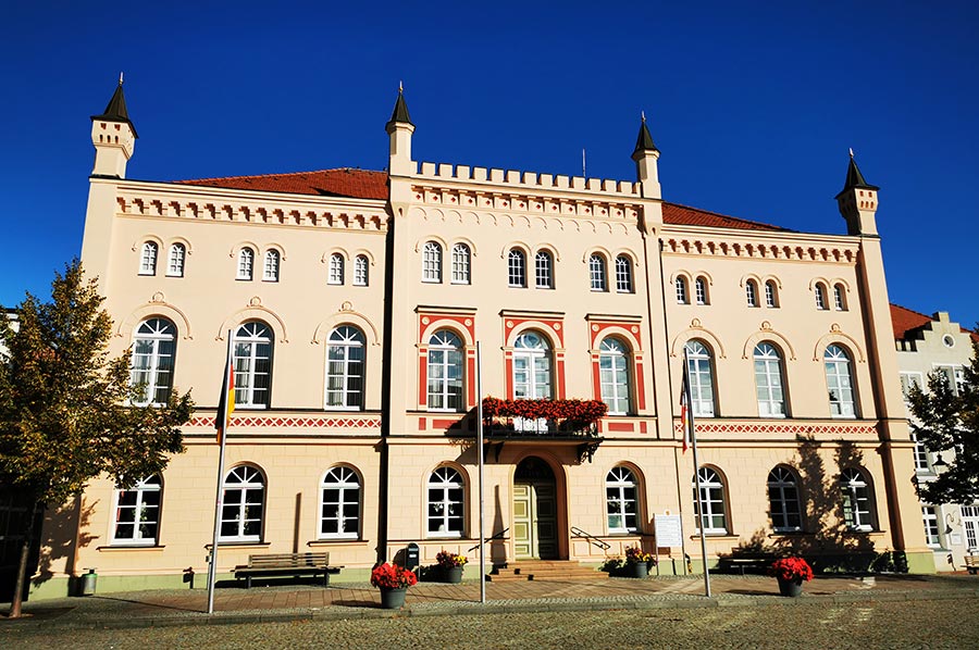 Impressive a little later is the tourist office with its Sternberger book box (unfortunately both closed) and in particular the town hall on the "market square", originally a two-storey half-timbered building from the middle of the 18th century, which received the market front with its Tudor Gothic plaster architecture in 1850 and was completely renovated around 1994. We hadn't expected this. The historic town centre with its grid-shaped street network is interesting in general, typical of which are the half-timbered houses (e.g. Kütiner Straße 7 and Luckower Straße 25), which were built after the great fire of 1741. Decorations on the crossbeam on the first floor are the characteristic ornament. The market square was renovated in 2009.