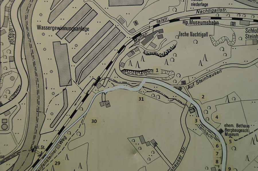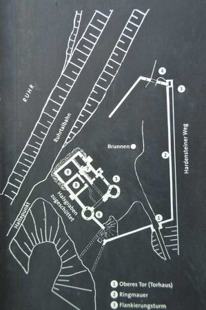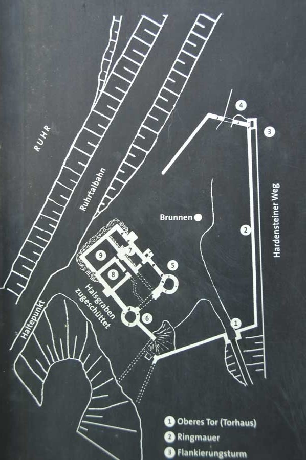 Immediately following the southern enclosure wall the mining trail Muttental starts; on the north side runs the route of the RuhrtalBahn museum railway, which separates the castle complex from the Ruhr. Here another breakpoint is quite impressive.