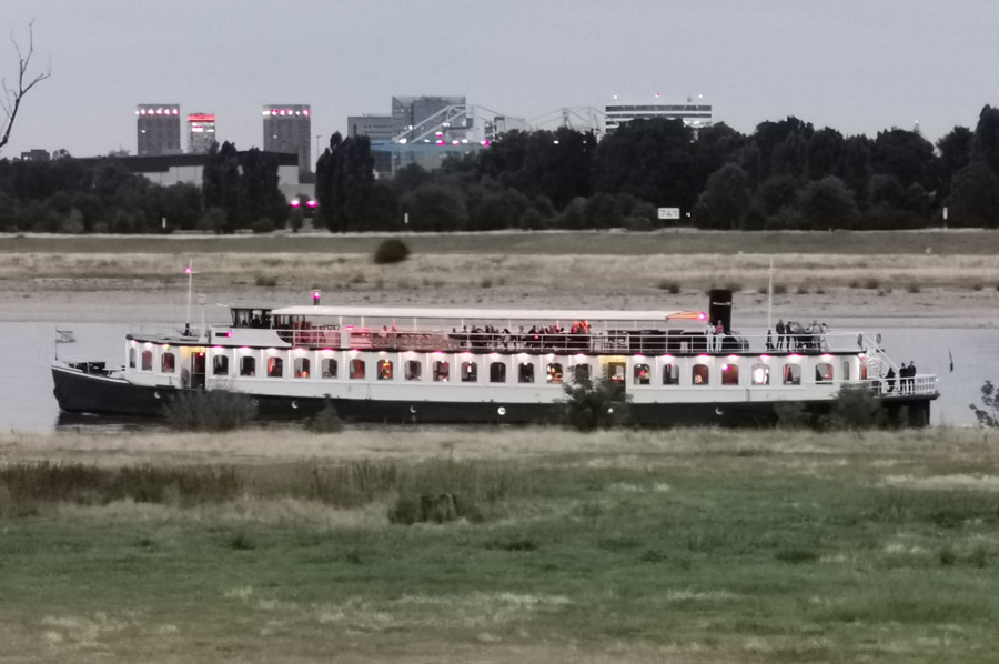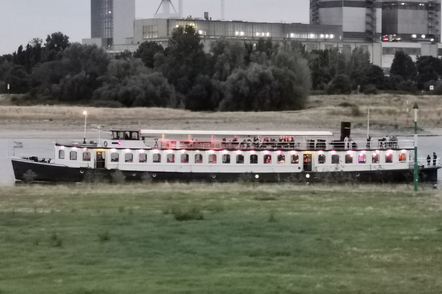 However, we probably chose the wrong day, because Friday is party time in Düsseldorf. Party-goers over the age of 30 can storm the dance floors on one of the event yachts at the so-called Ü30 parties and crank up the flirt factor. Party music, nice people and delicious cocktails ensure the best atmosphere, the view of the nocturnal city panorama of Düsseldorf maybe even a touch of romance. We could see such a party ship from the shore, the music could be heard from afar.