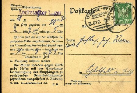 However, this decree only came into force for new railway lines, and the blunt oval stamps were to be replaced by the pointed oval stamps when they were worn out. In contrast to the blunt oval stamps, which had plug-in types for the date and train number, the pointed oval stamps could be adjusted using type wheels. On some lines, the new introduction lasted until around 1930. According to decree no. 155 in the official gazette 20/1931, the stamps used at the railway posts were referred to as "route stamps". In September 1933, another change occurred when the Reichspostzentralamt declared in communication 427 482/1 that all stamps with route information were to be referred to as route stamps, and at railway posts specifically as "railway post stamps".