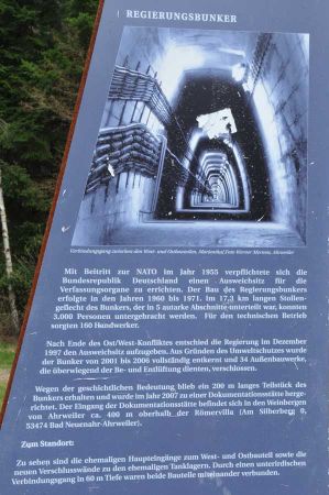 After the end of the Cold War, the plant was shut down for cost reasons at the end of the 1990s. Just a few years later, the complete gutting of almost the entire complex began. Today just a small part of the bunker, 203 meters long, remains of the most expensive building in the Federal Republic, which has been converted into the Museum Documentation Center Government Bunker. The museum is located on a wooded mountain slope above the Roman villa in Bad Neuenahr-Ahrweiler. In 2009 the government bunker was declared a European cultural heritage by the European Commission.