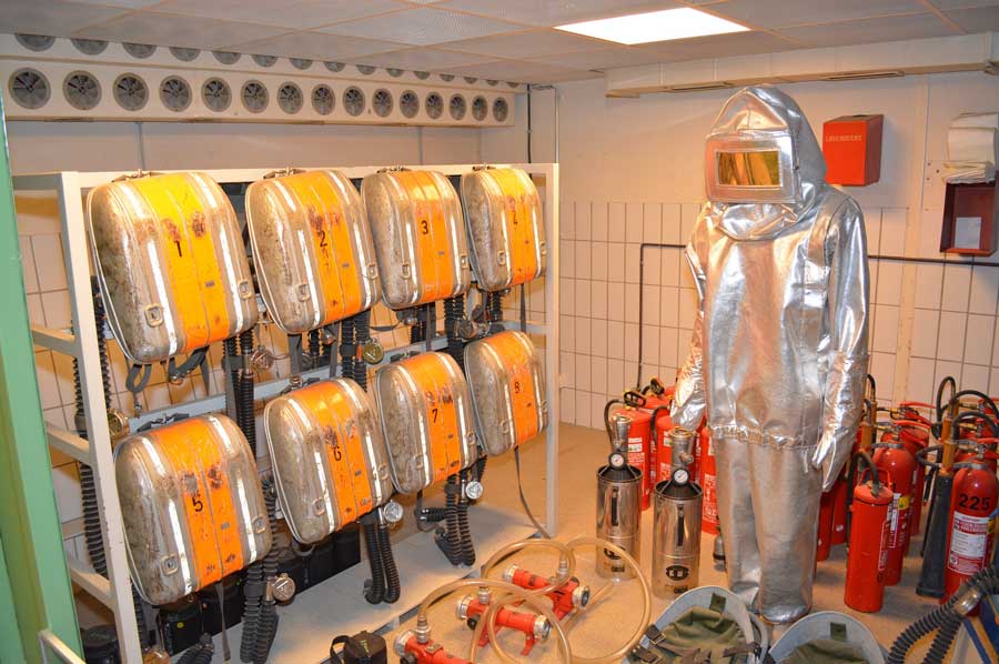 Gates and ventilation covers on the supply air structures that could be closed in fractions of a second were able to hermetically seal the bunker. A drinking water supply from two of its own deep wells, its own power generator, air filter and supplies as well as an infrastructure with kitchens, hospital, dentist, etc. enabled a 30-day stay without contact to outside. This was intended to ensure in the event of a defense (V-case) that the Federal Republic of Germany could continue to rule even in a nuclear escalating war and that the Bundeswehr could continue to be led.