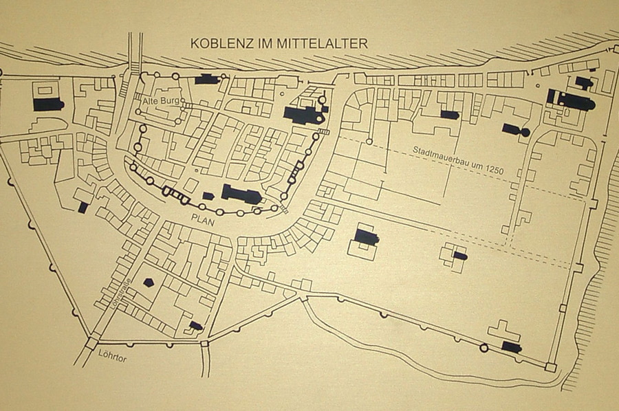 After the Limes was abandoned, under Emperor Constantine (306-337) a 5.8-hectare fortification was built in the area of today's Koblenz old town, the late antique Confluentes Fort. Located on the flood-free ridge on the southern bank of the Moselle, its former extent is still clearly visible today. The surrounding moat probably formed a former arm of the Moselle and its course is still traced today by the streets “An der Moselbrücke”, “Alten Graben”, “Am Plan”, “Entenpfuhl” and “Kornpfortstraße”.