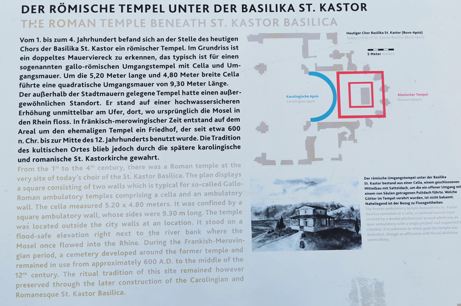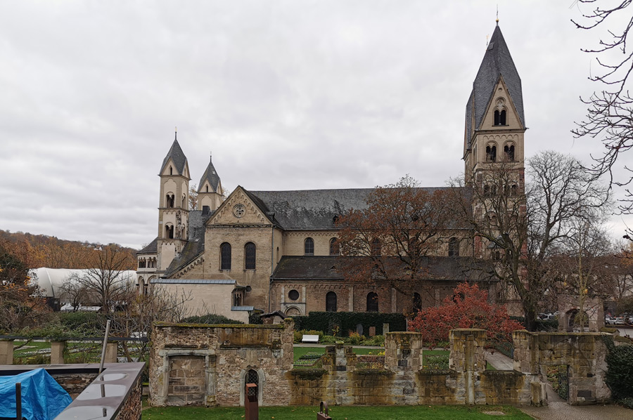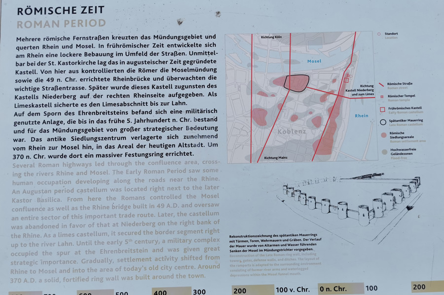 Koblenz area has been inhabited since the Stone Age. The Romans first built a fortified urban settlement here in the area where the Moselle and Rhine meet. The Confluentes fort was built in what is now the old town centre to secure the Roman Rhine Valley Road (Mainz-Cologne-Xanten) and in Niederberg the Niederberg fort to secure the Limes and the first bridges over the Rhine and Moselle. Koblenz is one of the oldest cities in Germany. After the retreat of the Roman troops in the 5th century, Koblenz was conquered by the Franks, who founded a royal court here. In the Castor Church, consecrated in 836, which we will come to later, negotiations between the three grandsons of Charlemagne took place in 842, which finally led to the division of the Frankish Empire in the Treaty of Verdun in 843. Castellum apud Confluentes (German "castle at the confluence") was the Latin name for the Roman settlement at the confluence of Moselle (Mosella) and Rhine (Rhenus), from which the German city of Koblenz developed.