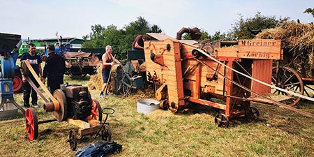 Aging agricultural machinery such as Schlüter, Deutz, Kramer, Porsche or Deering tractors from the 1950s and especially the legendary Lanz Bulldogs are still particularly attractive today when, for example, a threshing machine can be operated with them via a belt drive.