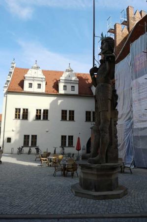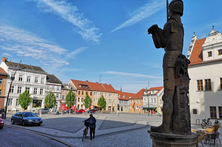 In front of the arbor is a sculpture of Rolandsfigur, made of stone. This figure is a copy from the year 1974 of the sculpture of 1525, which is kept in the Altmark Museum. The 7.80 m high figure is equipped with plate armor, a shield with the Brandenburg eagle and a shouldered sword. On the back, a fool figure with bagpipe and coat of arms is depicted on an ornamented column.