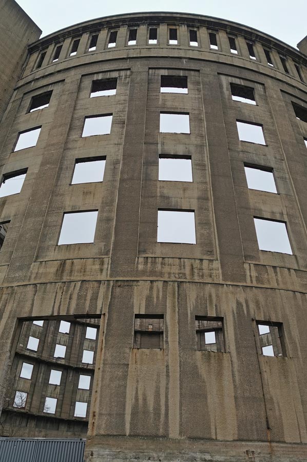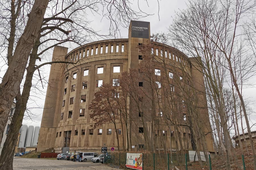 The imposing reinforced concrete structure of the third gasholder consists of a cylindrical, shell-like body rising over six stories, which appears to be held up by five cubic stair towers. The old Erlwein gasholder III can now only be seen as a ruin opposite the exhibition building, although it is almost as tall as the tower of the Frauenkirche, albeit without a cross.