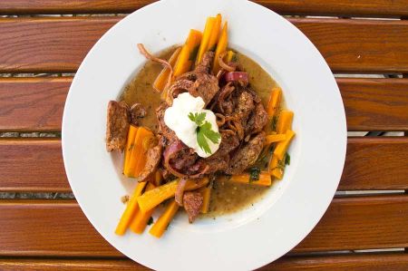 The onion meat is a beef dish with plenty of onions. It is refined with the addition of rolls, sugar, salt, black pepper and caraway seeds. Pork broth from the bone is poured over the dish. It is a hearty dish.
