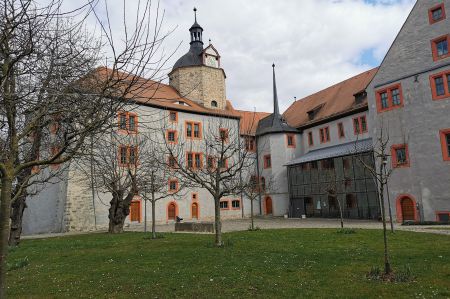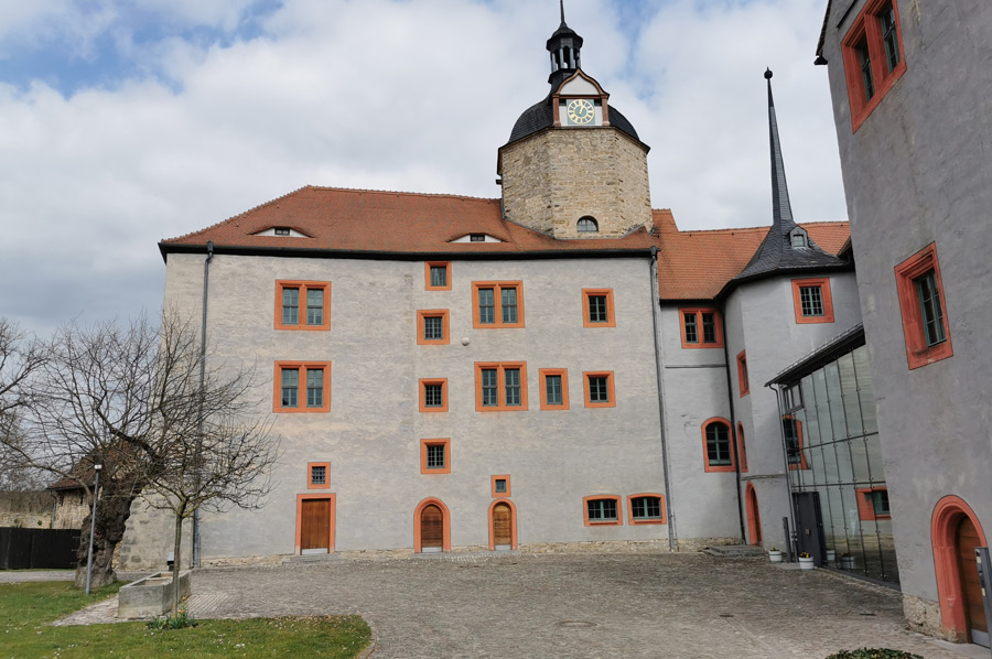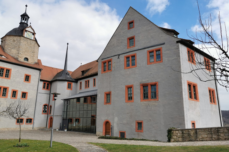 The so-called Old Castle, which was probably built by 1522 on the foundations of the Ministerialburg Dornburg, which was severely damaged in the Saxon war in 1451, is the northernmost and oldest of the three Dornburg castles. Any existing parts of the previous ministerial castle were included in its construction. From 1562 to 1573, Duke Johann Friedrich II of Saxony undertook further conversion and expansion of the palace. During the Thirty Years' War, the city and castle were plundered and devastated by imperial Croats. The castle was the widow's seat of Wettin prince widows three times. After Duke Ernst August of Saxe-Weimar-Eisenach moved out of the palace in 1717, the palace lost its importance and became the administrative seat of the Dornburg office. From 1750 the castle was used, among other things, as a cotton mill, barchent (textile) factory and school. The castle began to deteriorate in the 19th century. Grand Duke Carl Alexander of Saxe-Weimar-Eisenach had the first monument preservation work carried out on the palace in 1883. After 1945, the old castle was temporarily used as a retirement home, but continued to deteriorate in the decades that followed. After German reunification, the Old Palace was transferred to the Thuringian Palaces and Gardens Foundation on June 26, 1995. It was then extensively restored with funding and has since been open to the public for pre-booked tours[3] from April to October. Since 2004, the Old Palace of the Friedrich Schiller University Jena has served as a meeting place.