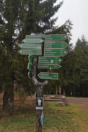 The roundabout is now an important landmark on the Rennsteig and the starting point for many hikes and of course known for the region for ski hikers and cross-country skiers, as well as for us as hikers. A bridge leads to the sports facilities of Oberhof, e.g. the biathlon stadium. Boards show hiking trails that lead to the sights in the area, so there was a monument to the reforestation of the Rennsteig ridge after terrible wind damage in the post-war years. Some of the leupes were still clearly visible because there was still a lot of snow left. So it went a few kilometers through the forest, every now and then we met the big R, the sign of the long-distance hiking trail. Unfortunately, it was becoming increasingly difficult to see into the biathlon stadium. We went to the restaurant in the huge parking lot of the stadium for physical strengthening, of course it should be a Thuringian bratwurst from the charcoal grill, which once again tasted delicious.