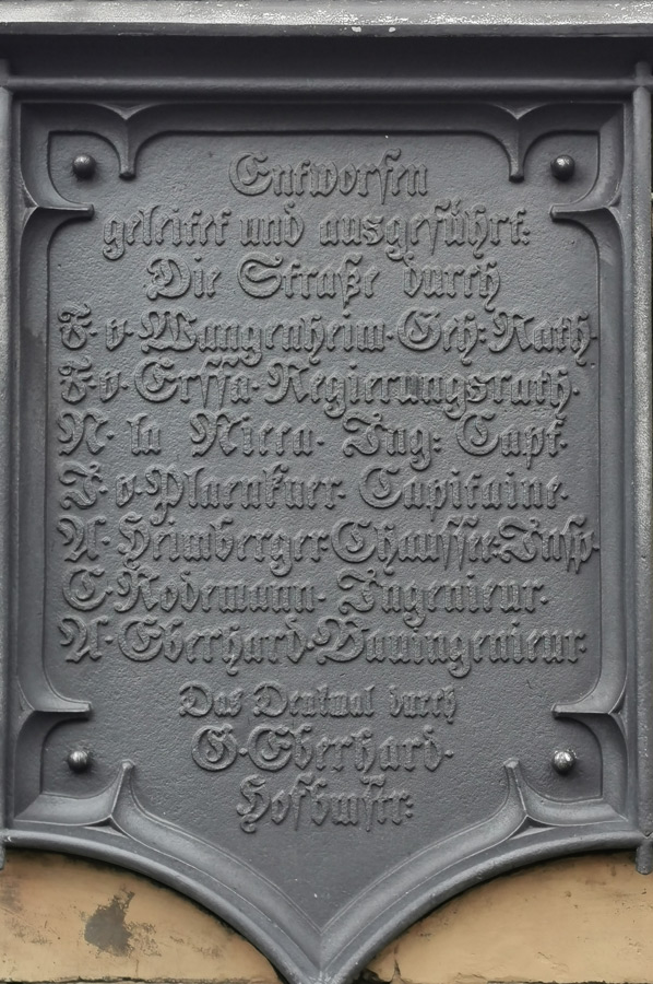 The seven meter high obelisk erected in 1834 was designed by the Gotha court architect Gustav Eberhard. Four inscriptions are attached. One has the names of those involved in road construction. The three other inscriptions read: