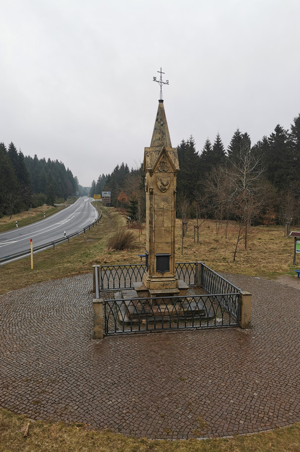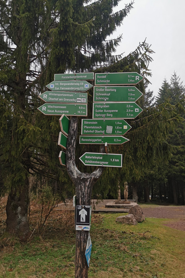 Driving a little later in the direction of Oberhof and despite the cloudy weather, we reached the large car park at the roundabout. The roundabout near Oberhof is actually a stone obelisk and thus a monument to the history of traffic at the intersection of the Thuringian state road 3247, the former federal road 247, with the Rennsteig, the ridge and about 170 km long ridge path and historical border path of the Thuringian Forest. The Rennsteig is also the oldest and, with around 100,000 hikers every year, the most frequented long-distance hiking trail in Germany. It begins in the Hörschel district of Eisenach on the banks of the Werra and ends in Blankenstein (Rosenthal am Rennsteig municipality) at the Selbitz Bridge. Its waymark is a white R.