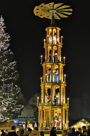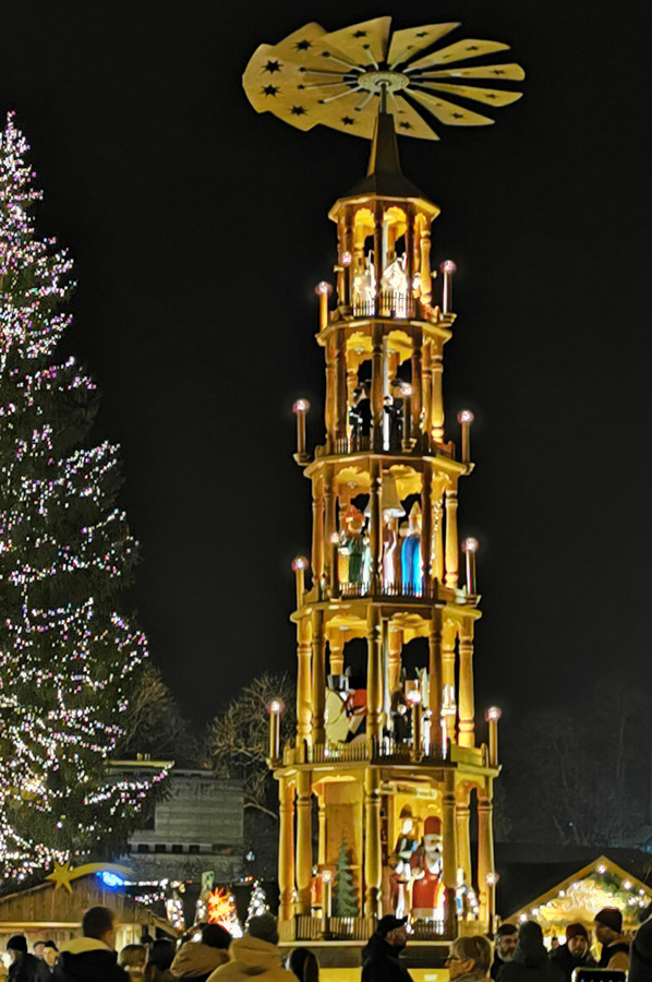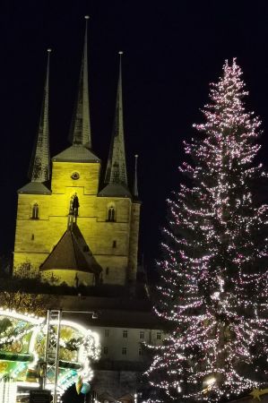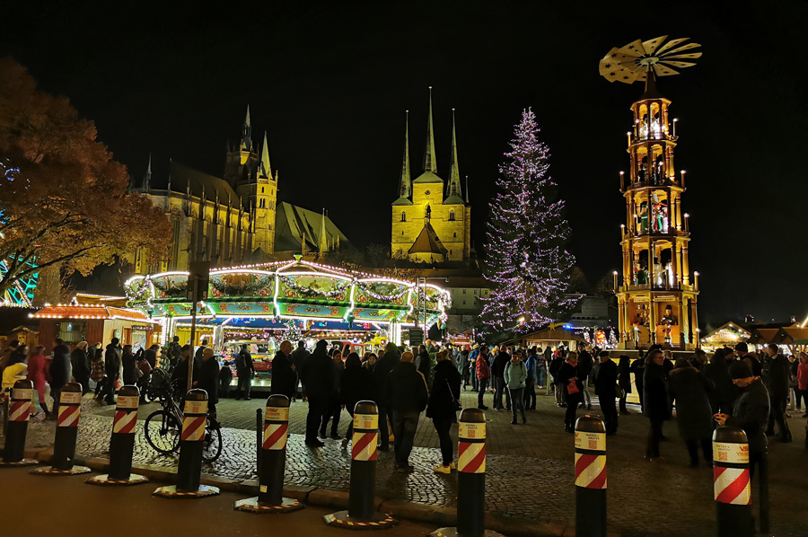 Particularly noteworthy is the approximately 25 meter high, festively illuminated Christmas tree and almost directly next to it the 12-meter-high Christmas pyramid, which depicts people from Erfurt's history and Christmas scenes on five floors.