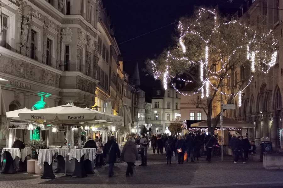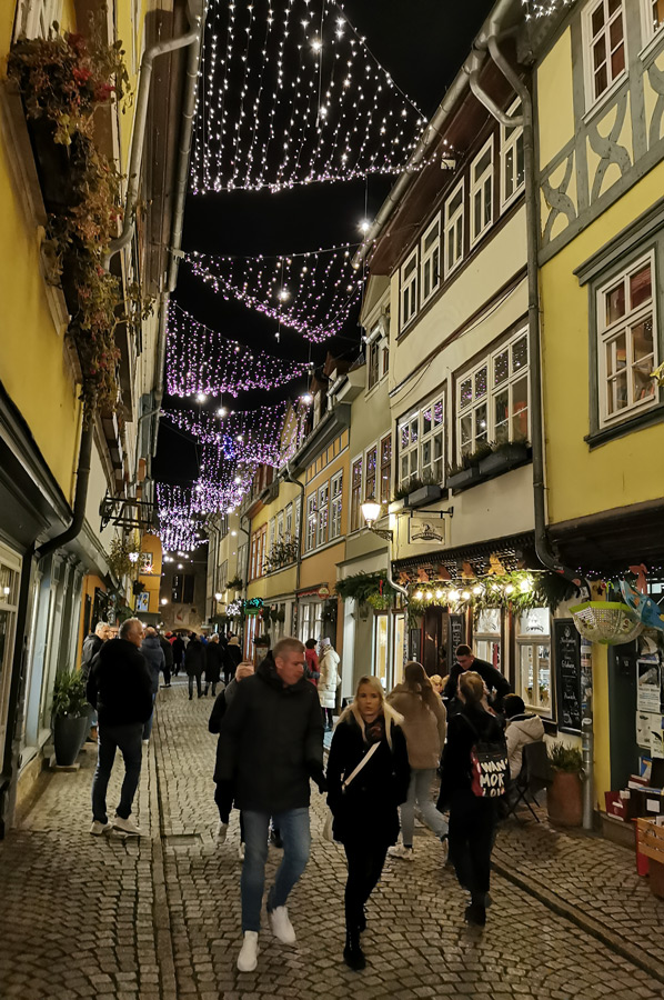 The city centre is festively decorated and illuminated with a Christmas flair, because the small boutiques and galleries, especially on the Krämerbrücke, and the small but fine shops in the side streets are bathed in Christmas light and invite you to go on a shopping spree through the city centre. So to us too.