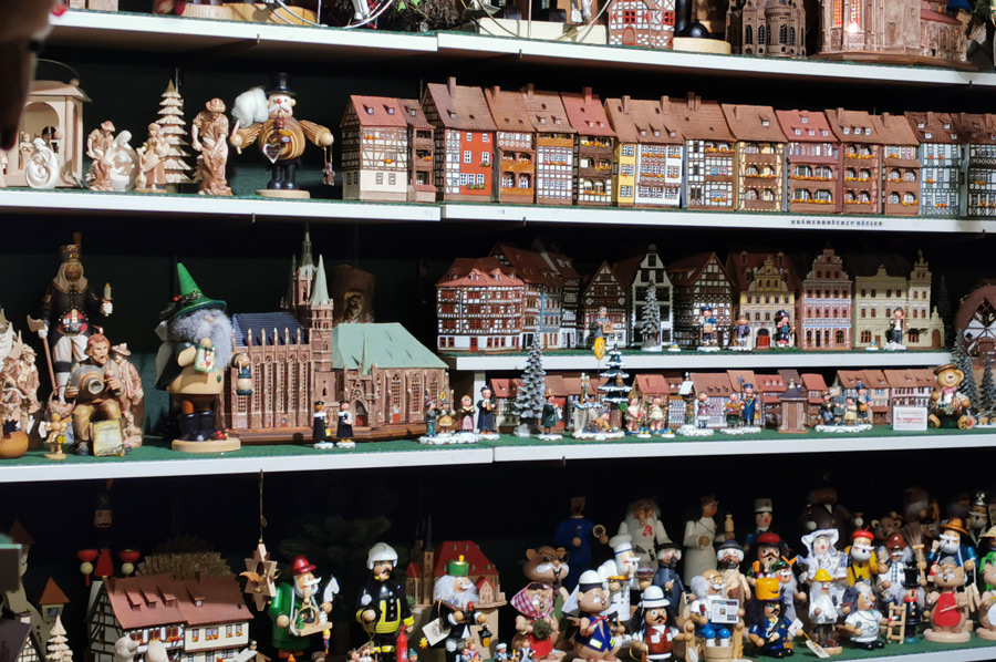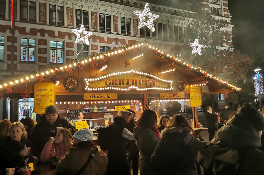 Traditional, regional handicrafts and Thuringian specialties, above all still the Thuringian bratwurst, can be found as well as a huge, candle-decorated Christmas tree with a nativity scene and hand-carved, almost life-size figures as well as many shops in the style of showmen.