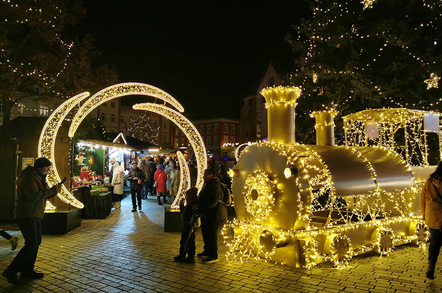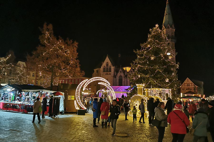 The traditional Meiningen Christmas magic around the Heinrichsbrunnen takes place in an impressive setting in front of the town church on the market square. Around 30 festively decorated huts offer a variety of culinary temptations as well as a fine selection of original gift ideas. Another highlight is the 8-meter-high Christmas pyramid, in which the Meiningen open work invites young and old to linger with hot drinks.