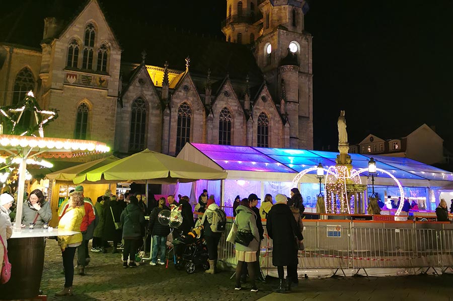 The Meiningen Christmas market has one of its highlights back: From mid-November 2023 to the beginning of January 2024, visitors can experience the magic of winter at the Meiningen Christmas market while doing laps on the ice rink around the Heinrichsbrunnen. Young and old can skate safely on the coolest ice rink in southern Thuringia. Experienced ice-skating fans get their money's worth here, as do little beginners who can easily glide across the ice with the Bobby walker.