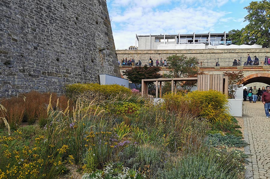 The path up takes us past the Ravelin Peter, which protected the entrance to the Petersberg fortress from 1708. The main moat bridge was built in wood from 1665 and secured with a drawbridge. In 1864, a new building was built as a stone arch bridge with seven bays and another drawbridge. This was no longer needed when the fortress status was revoked in 1874 and another stone arch was built in its place. After 1920 the moat was partially filled in and the arches walled up. In the 1990s the ravelin and the moat systems were restored.