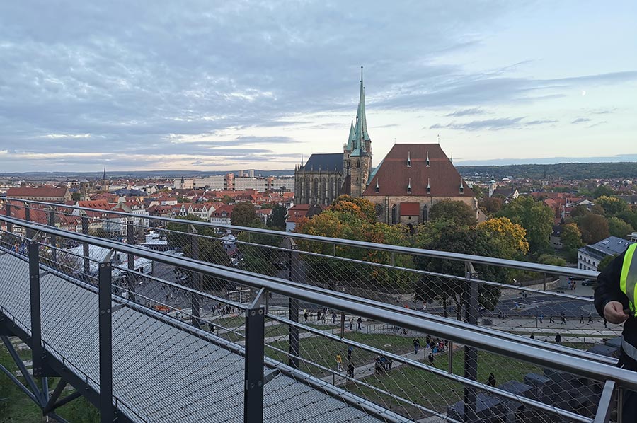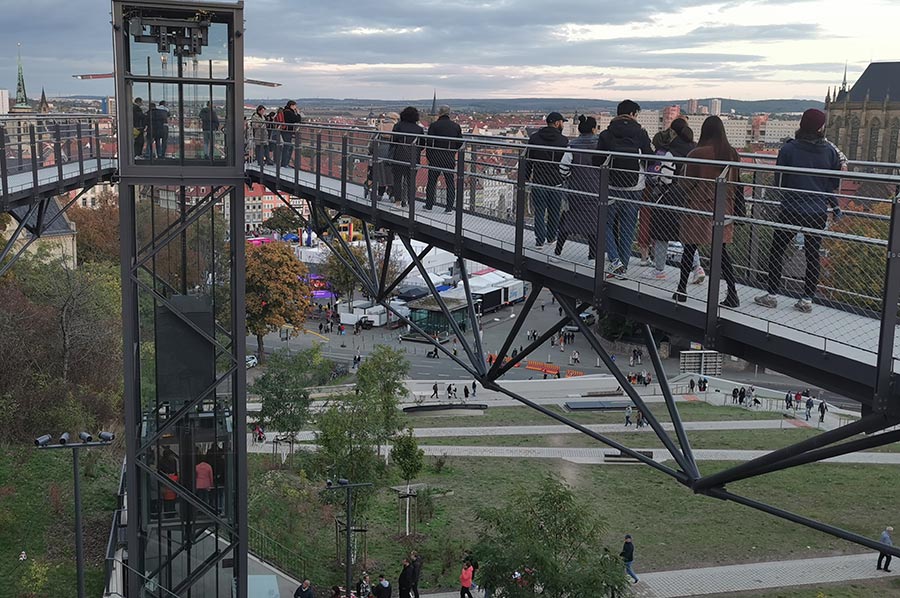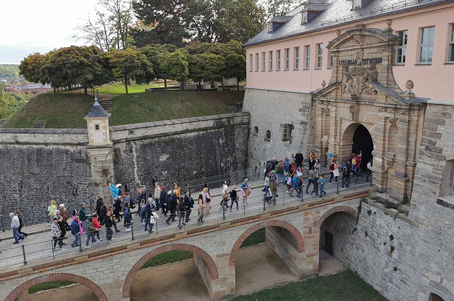 Today, when visiting the citadel, you can explore the new exhibition in the commandant's house and the listening galleries in the strong walls of the fortress or simply enjoy the fantastic view over Erfurt's old town, which we now often do in order to visit the small, manageable shops in the old town beforehand or afterwards. To ensure that as many sections of the Petersberg Citadel as possible are available to all guests, access to the fortress grounds has been completely redesigned. A passenger elevator on the fortress wall to the upper plateau makes it easier to climb. The panoramic path, which begins at Domplatz, also makes it possible to reach the citadel independently and without any additional aids.