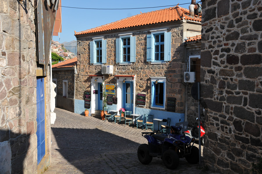 It is perhaps the location of the town on a slope that has ensured that the town center can only be reached via narrow stairways, which means that Mithymna can now be described as car-free. A very valuable attribute in our modern times. The place itself still conveys a strong influence of Ottoman culture and architecture from the former affiliation to the Ottoman Empire, giving an almost oriental, medieval impression. The narrow, sloping stairways and driveways are often covered by climbing plants, creating a wonderful play of light between the shops and restaurants. The many well-preserved houses from the 18th century, built in the traditional Ottoman style, consist mainly of unplastered natural stone on the ground floor, with the upper floor built of wood on the false ceiling. Some of the beams and beam heads of the load-bearing support system are richly decorated and protrude far beyond the ground floor, so that bay windows with many windows could be formed on them.
