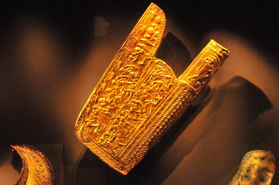 Both in the pre-chamber as well as in the main chamber were, among other things, a golden Larnax, which was decorated with a star, so-called star of Vergina. The Larnax in the main chamber contained a golden oak wreath and, once wrapped in a purple cloth, the burned bones of a man. The bones belong to Philip II., Father of Alexander the Great.