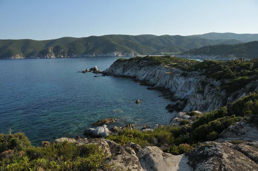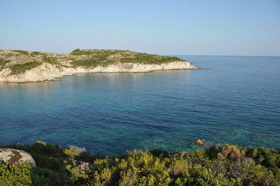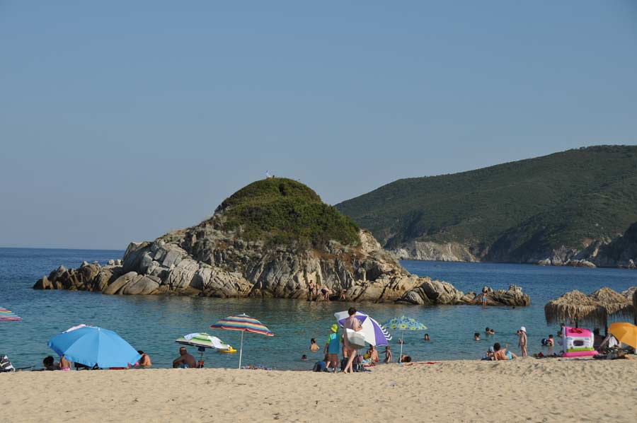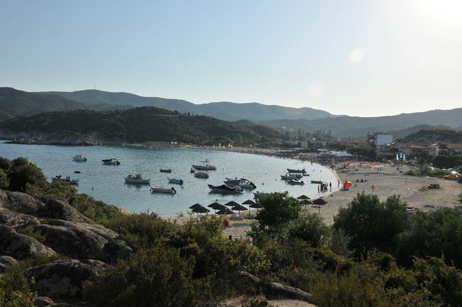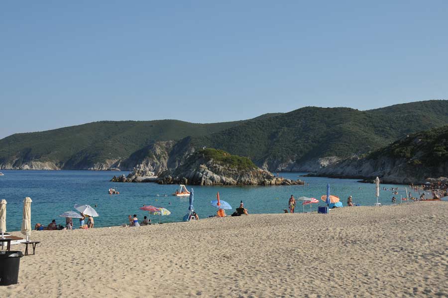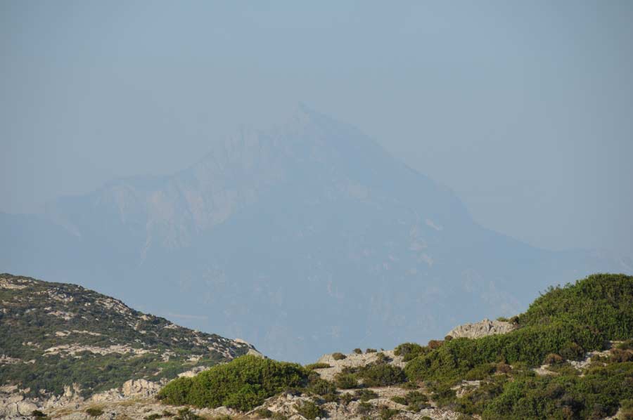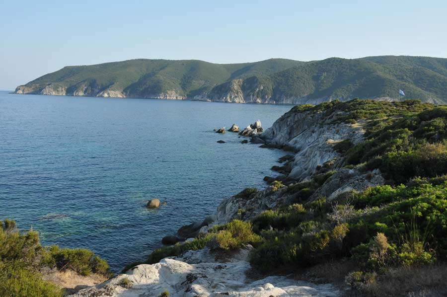 Somewhat surprised, after exceeding the outcrop behind the harbor, we encountered a small settlement of naturists, who have settled in the following, almost completely isolated bay. Actually interested in a photo of Mount Athos looming in the background, we briefly descend to the tent roofs of the nudists, where we were friendly welcomed. For years, there is this camp, where there are always some long-term residents and some continuously changing tourists. The connection to Kalamitsi, because just from there any "supply" can take place and it seems to be working, because a little later, we meet two of nudists in Kalamitsi again, this time modestly dressed.