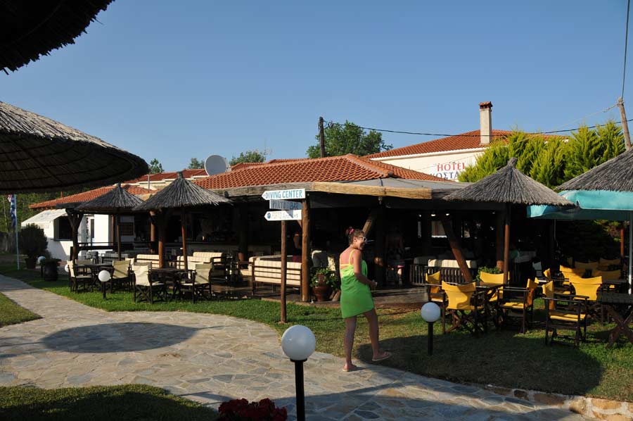 The entire bay is lined with rocks, and there is a small rocky island, which is often used as a target during swimming. We also meet a diving school, which starts to the different dive sites by dive boat from here. During our conversation with Sylvia, she is not only responsible for operating the bar in the diving school with adjoining restaurant, so she quickly shows the expertise of the diving operation, where in addition to the compulsory courses for beginners and advanced, wreck diving or cliff diving is possible.