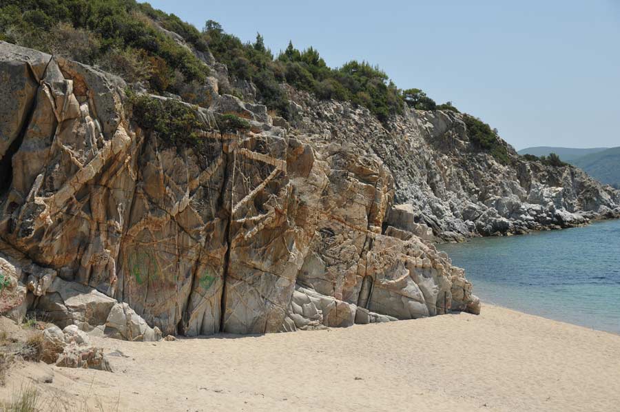 The municipality Sithonia entirely includes the Isthmus Sithonia with its area, which is characterized by a hilly landscape. To the north, towards the central land of Chalkidiki, Mount Vrachoto rises with 492 m height and separates the municipalities Metangitsi in the north and Agios Nikolaos in the south. The municipality Metangitsi located in a hilly valley, which runs from northwest to southeast until the sea. The municipality area located south of the Isthmus of Sithonia is dominated by the ridge of Itamos with about 808 - 811 m height.