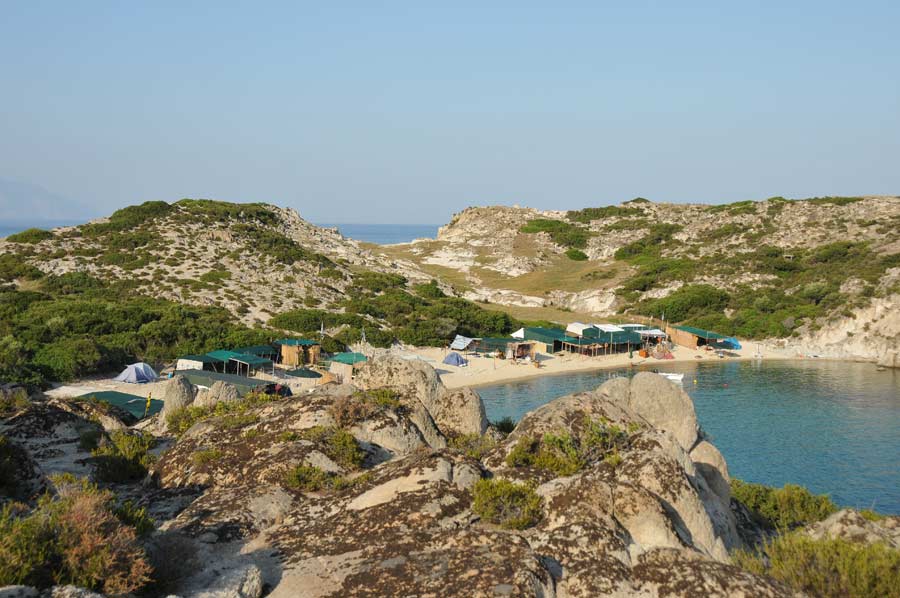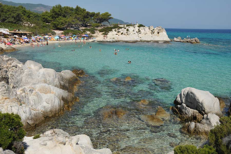 Also known as Orange Beach, this spot features a series of tiny bays framed by white rocks and pine trees. The emerald water and natural rock formations make it one of the most photographed places in Halkidiki.