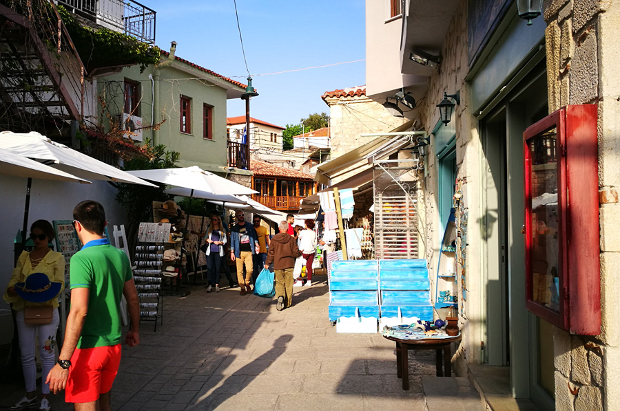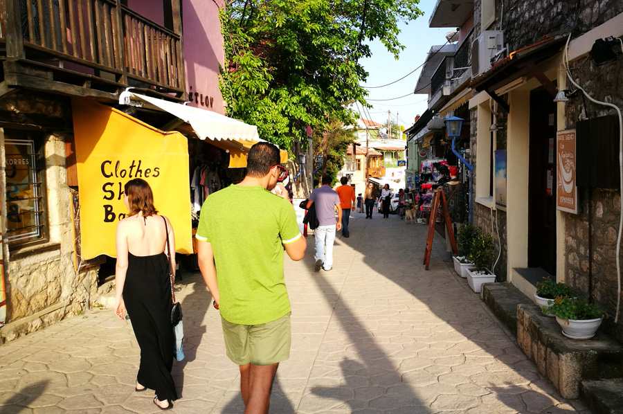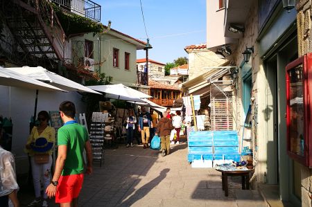 Afytos is located just off the main road leading south on the east coast of Kassandra. Afytos, also Athytos, is located 75 kilometers southeast of Thessalonica and 45 kilometers from the capital of Chalkidiki, Poligyros. The roads to Afytos are however not particularly well signposted. You have to look a little to get the right exit. As you are reaching Afytos the roads becomes ever more narrow, in the place itself it is very narrow because in many cases the streets become one-way streets or pedestrian areas. In addition, there is a lot of traffic. Many excursionists want to visit Afytos and also the buses are not afraid to enter the narrow place. So we had also got into the pedestrian areas against better knowledge. It was, at all, not a problem with the southern calmness.