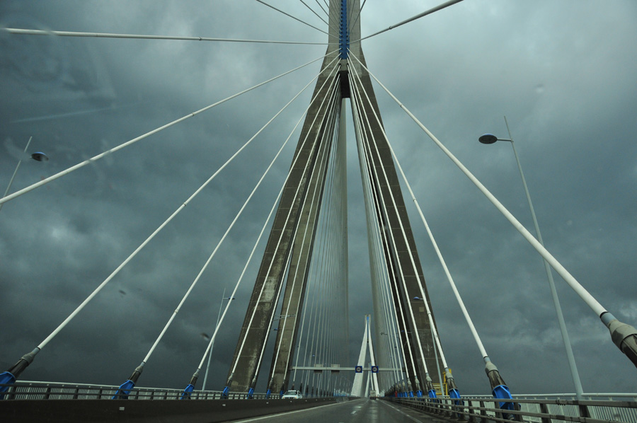The two outer pylons are in slightly less deep water and reach a height of 141 m above sea level. The bridge deck is shaped by an all strait spanning buckle upward. The middle passage has a clear height of 52 m. Based on the length of the main bridge, it is the second longest cable-stayed bridge in the world.