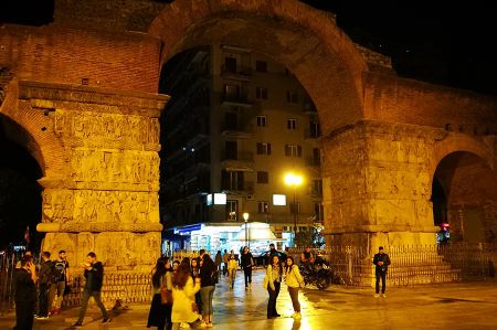 Another green belt connects the Rotunda with the triumphal arch of Emperor Galerius (305-311) from 306, the Arch of Galerius (Kamara) with relief depictions of scenes from the battles of Galerius against the Persians in 296/297, which once spanned the Via Egnatia and the entrance to the grounds of the imperial residence was marked. Not far away we come across the remains of a forum (145 × 90 m) with an underground stoa under the south stoa and an odeion (theatre), whose pillars with magnificent relief figures from a two-story hall are now in the Louvre in Paris.