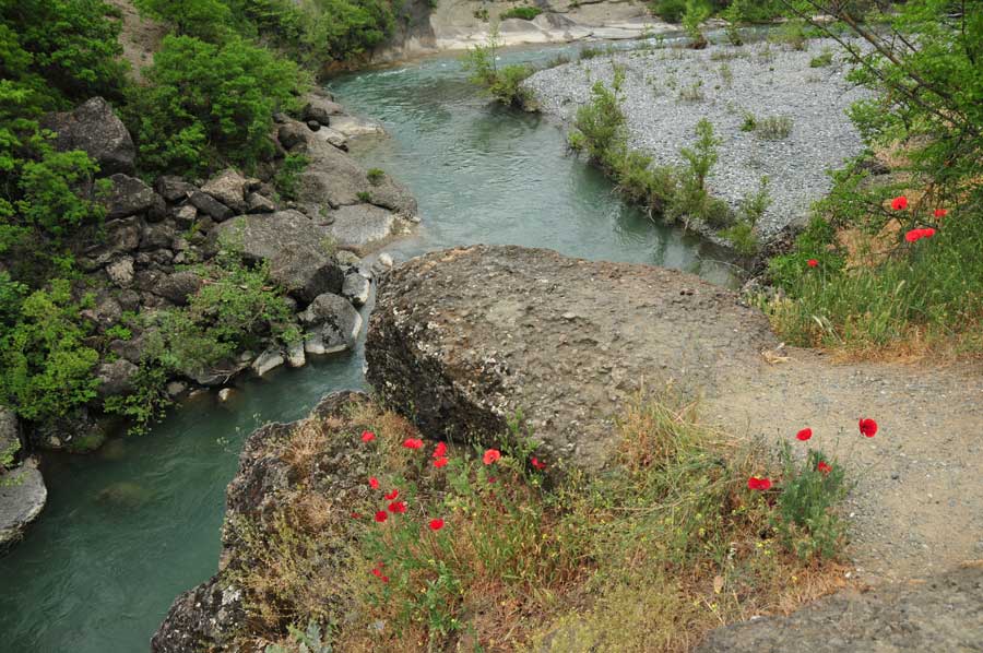 Deep calm pools alternate with slightly blocked floods, at first glance, the passage between the big blocks is not always the same, luckily it looks wilder than it really is! A few small play areas offer variety on this scenic river, towards the end of the season sometimes big stones are blocking. Before the mouth in the Aliakmonas the valley narrows again.