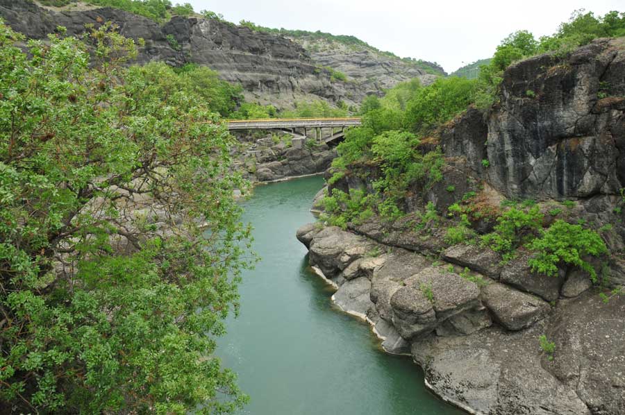 The Venetikos River is a not that much well-known river in the north of the Greek mainland, which rises into the up to 2200 meters high Pindus Mountains. However, most of the water it receives from its right tributary, the Mileapotamos. The river flows through a beautiful, low gorge of black conglomerate, which are of particular beauty at the bridge. So it is not surprising that a parking lot in front of the bridge invites passing travelers to a small stop, which we used again and again too.