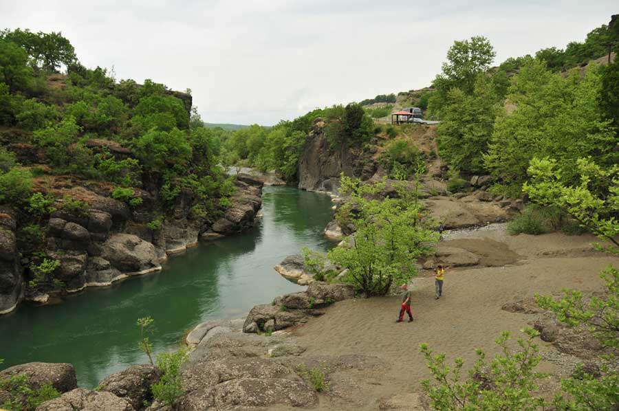 The usual site at the bridge north of Eleftherochori is quickly reached via the village of Kalochi. Here it is used above the bridge on the left bank. To avoid missing parts of the gorge, the kayak / canoes should be carried a little further up the river over a wide gravel bank. So you have taken a small splash and the entrance to the gorge.