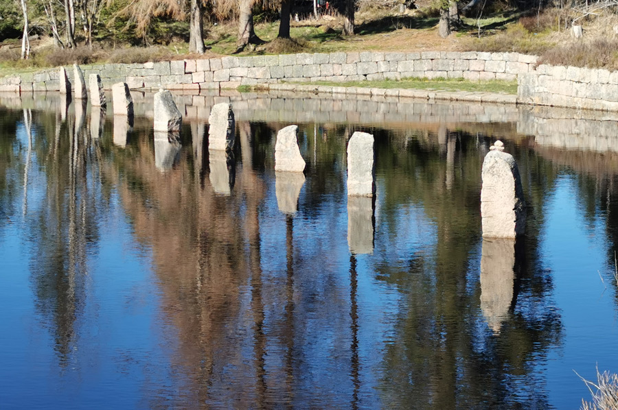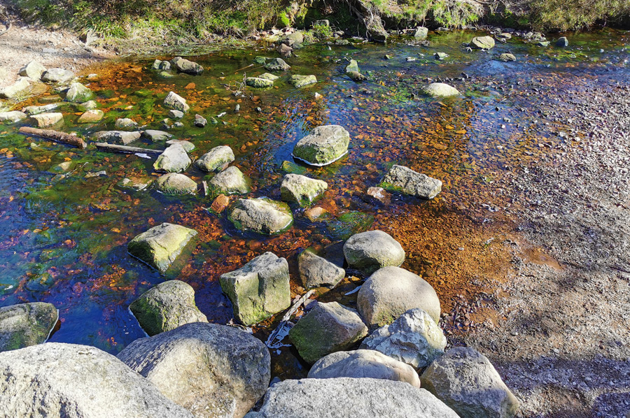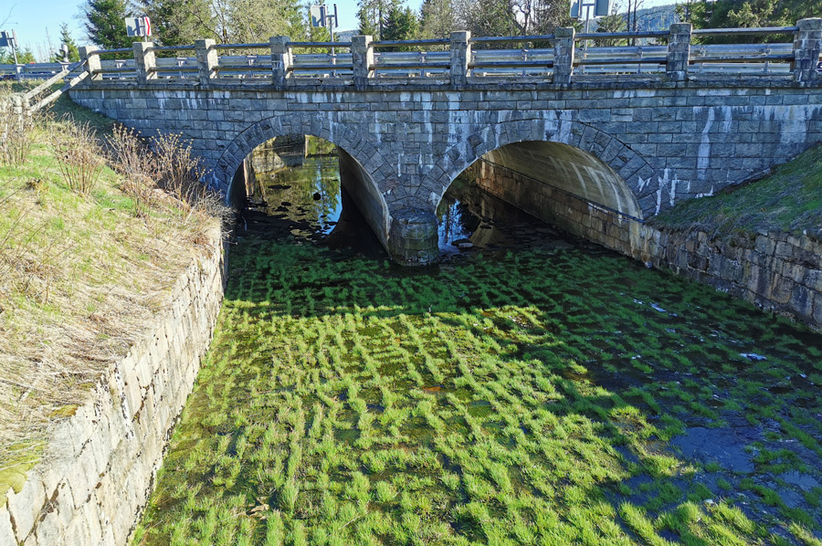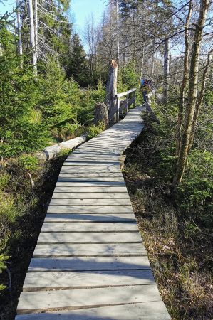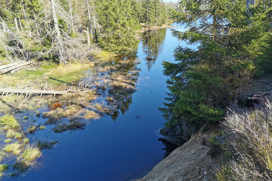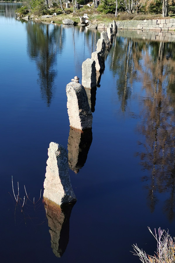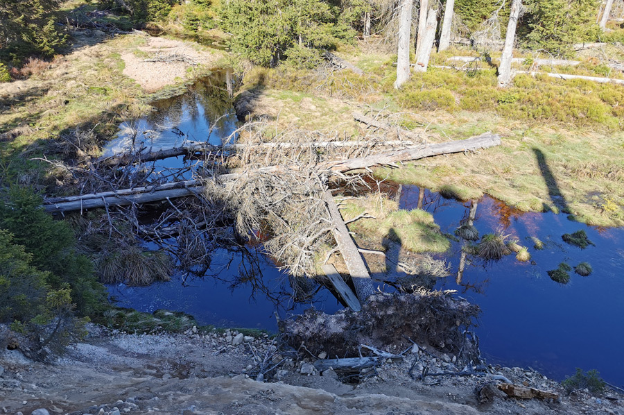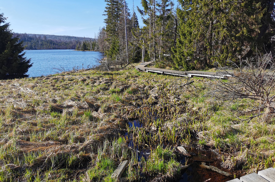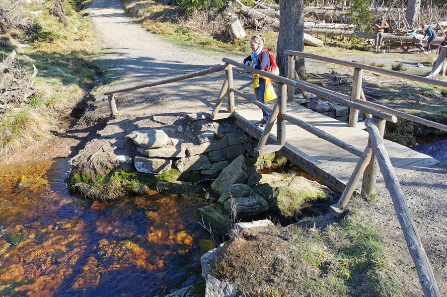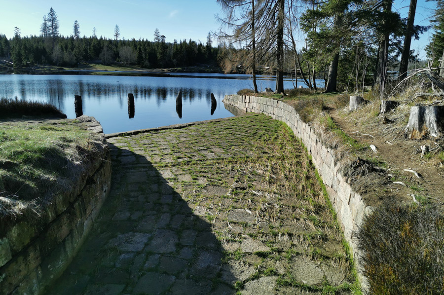After a few photos of the Oder, which flows into the Oderteich here, and the Rotenbeek, we set off again a little later. A first wooden plank walkway leads us over a first swamp area, further short passages follow later. In the last part, the entire path is built up, since it goes over extensive swampy areas. Everywhere you can hear a gentle splashing of the running water, a time for another rest period on one of the many benches that are set up here. A little later we have reached the dam wall, look at the massive overflow and the stone blocks reflected in the water.