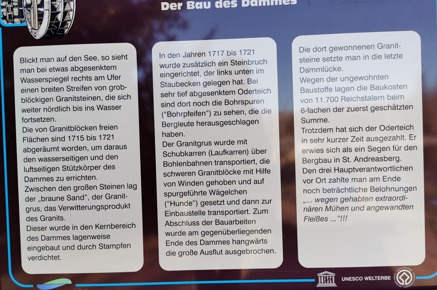 In 1703 the New Rehberger Graben was completed, which led Oderwasser to Sankt Andreasberg. This significantly improved the supply of water to the mines there, but the Oder could not supply enough water after a long period of drought. This triggered considerations of further improving the power water supply by installing a large water reservoir. Ten to 15 kilometres to the west, in the Clausthal-Zellerfeld and Hahnenklee area, 50 to 60 small dam structures were already in operation at that time. However, the architectural style there could not be copied because the sod used to seal the building was not available in the vicinity of the Oderteich (we have published the following article on this: Sod sealing in the dam core of the pond).