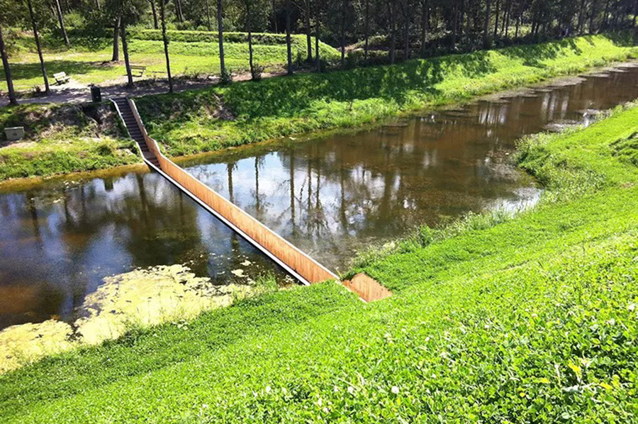 Moses Bridge consists of Accoya wood sheet piling on both sides, a hardwood deck and steps inserted in between. Accoya wood's durability and guaranteed performance in both soil and water make this possible. Acetylated wood is wood that has been treated with acetic anhydride in a chemical wood modification process to make it more difficult for wood-destroying fungi or insects to colonize it, thereby extending its useful life outdoors. Acetic acid is not toxic, so the recycling and disposal of the wood is still possible without restrictions. Acetylated wood also hardly absorbs moisture, which improves dimensional stability and durability.