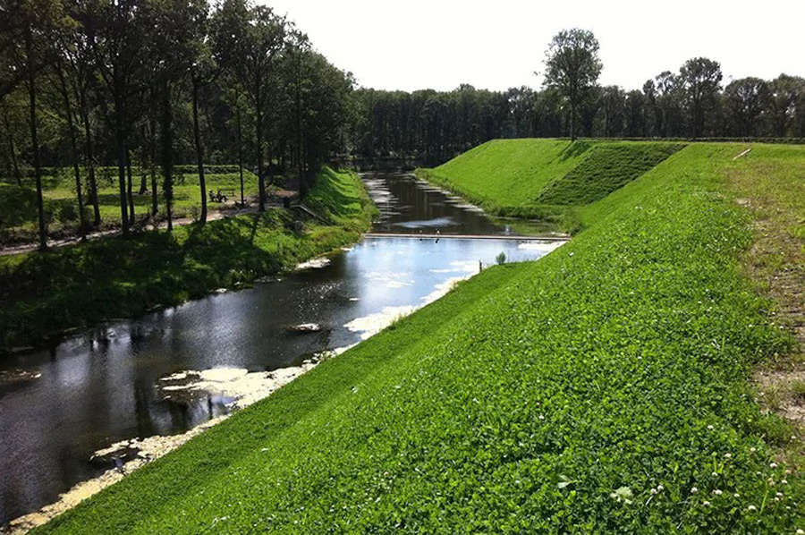 As part of a renovation project, Fort de Roovere, the largest fort in the complex, received an access bridge. This fortress is also surrounded by a moat and originally had no bridge, which in this case would also have spoiled the view of the complex. The task of the planners was therefore to design a bridge construction that was as inconspicuous as possible. Architects Ro Koster and Ad Kil's solution was a "sunken" bridge that follows the embankment line and ends level with the wall and the water table - "Moses Bridge". It is practically invisible when approaching the fort.